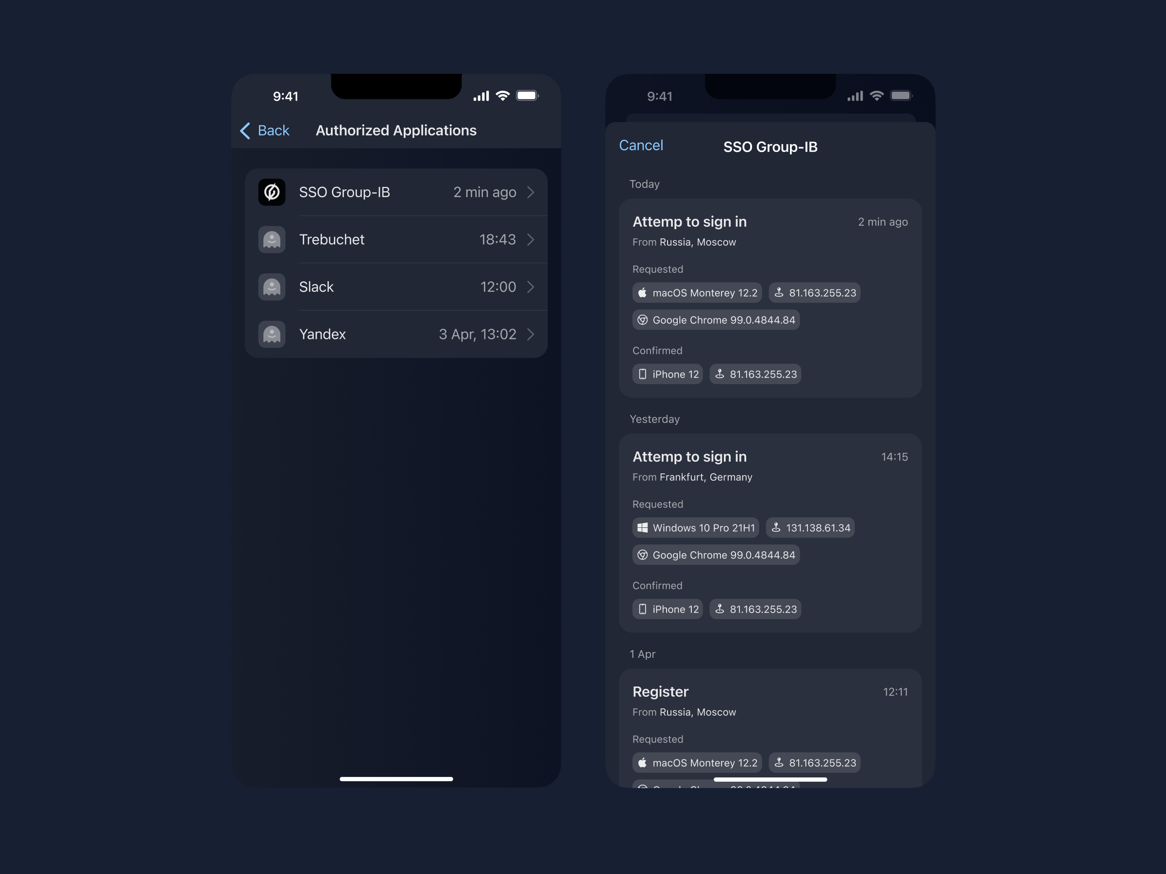 Authenticator – мобильное приложение под iOS для двухфакторной авторизации (2FA) во внутренних продуктах Group-IB. Оно заменяет пароли на Code + push-подтверждения с анализом поведения. Я спроектировал интерфейс для iOS, сделав его интуитивно классическим и понятным приложением.