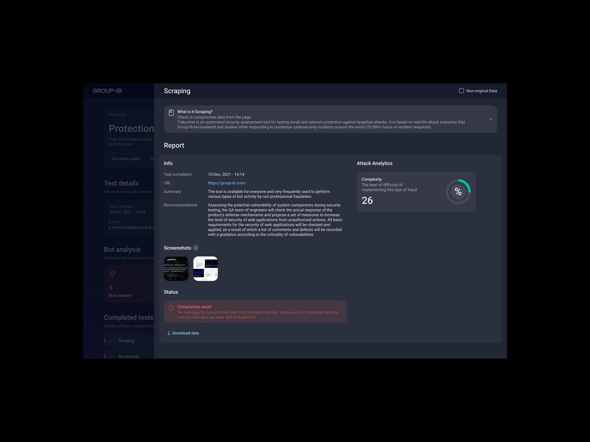 После получение ссылки на отчёт, пользователь сразу считывает результат (по выбранному тесту) и в каком состоянии находится, выдача короткое саммари о результате. Далее погружаемся в небольшой количественный анализ для короткой информации и общих фактов. Выполненные тесты помогают в точности определить слабые места, изучить их и улучшить защиту от потенциальных атак.