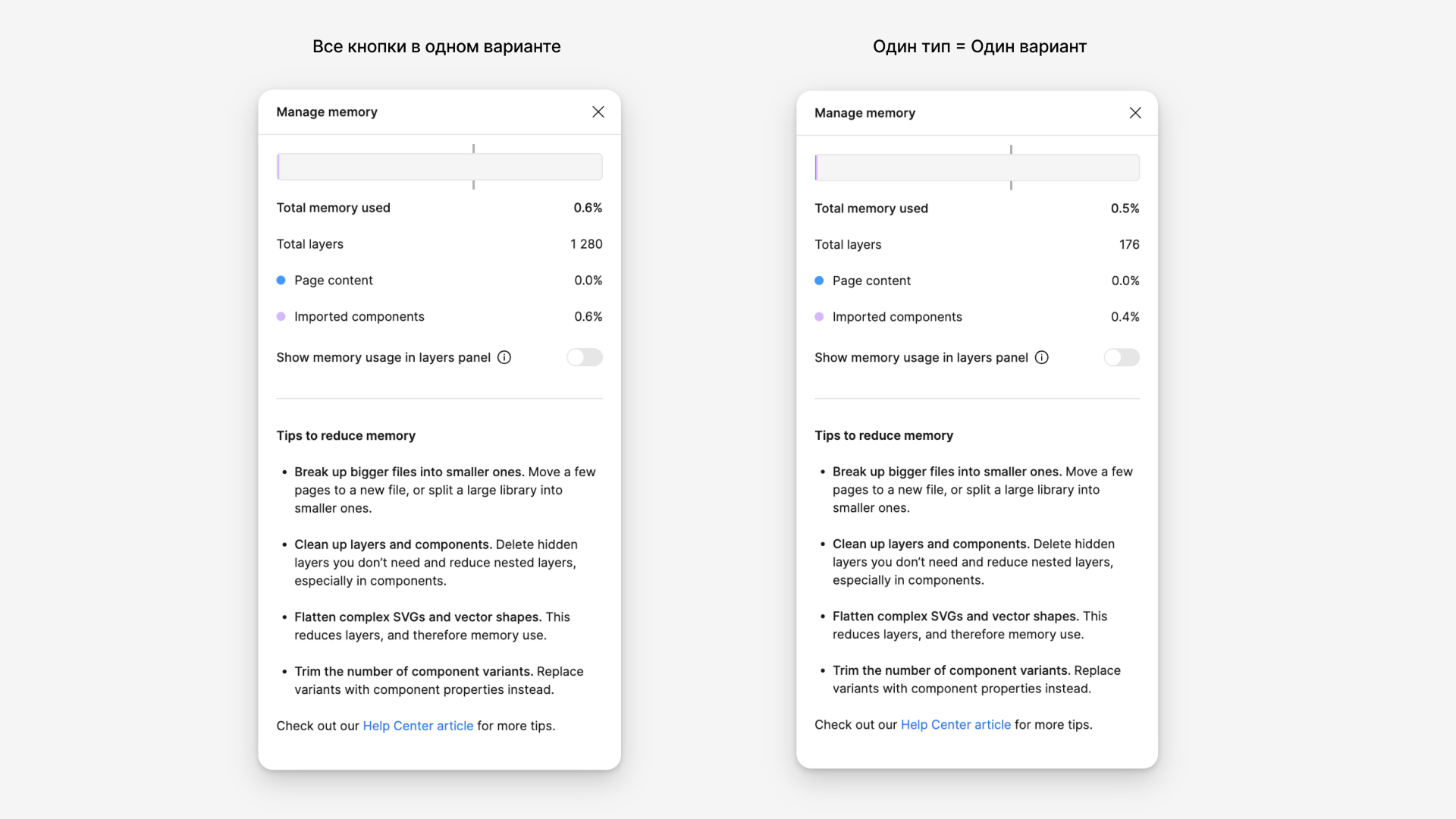 Для проверки можно увидеть количество слоём: если добавили компонент, в котором кнопки в одном варианте = 1280 слоём. Если компонент разбит на несколько вариантов, то в моём случае 176 слоём. На 86% меньше слоём, тем самым оптимизировав проектирование макеты.